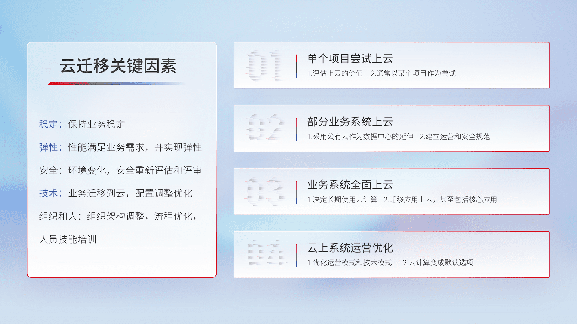 结合实际业务,,,从规划设计、、、云平台选型、、、、云原生改造、、、、数据迁移、、、集成交付,,,,迁移全过程为客户识别最佳上云路径,,做好风险识别管理,,,,设计网络架构、、身份权限、、、安全审计合规、、、操作审计、、、、日志审计、、、监控告警策略、、、、多站点容灾设计等,,,,对云上基础设施进行整体规划,,,,提升IT治理水平,,以满足弹性、、高可用、、、、高性能的需求。。。。