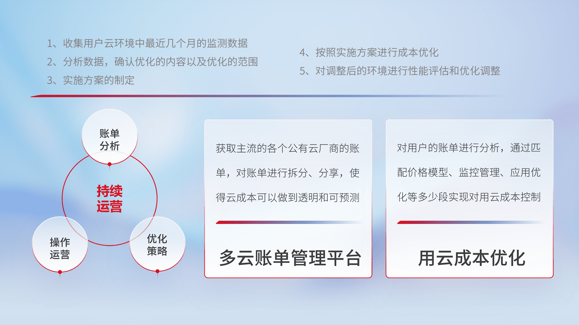 通过灵活运用多种自动化迁移工具,,,帮助企业用户实现业务和数据高效 、、稳定的上云迁移和云上迁移,,,采用自研多云纳管平台,,,,以中立管理模式,,解决多组织、、、多云、、、、多运维厂商的复杂关系的管理,,保证多云平台资源配置的一致性,,,实时掌控云资源运行数据,,,运用智能化工具分析云资源多云平台的管理服务,,,透明化管理成本支出,,,用云成本可预测、、用云费用可优化、、云资源配额有据可依。。。