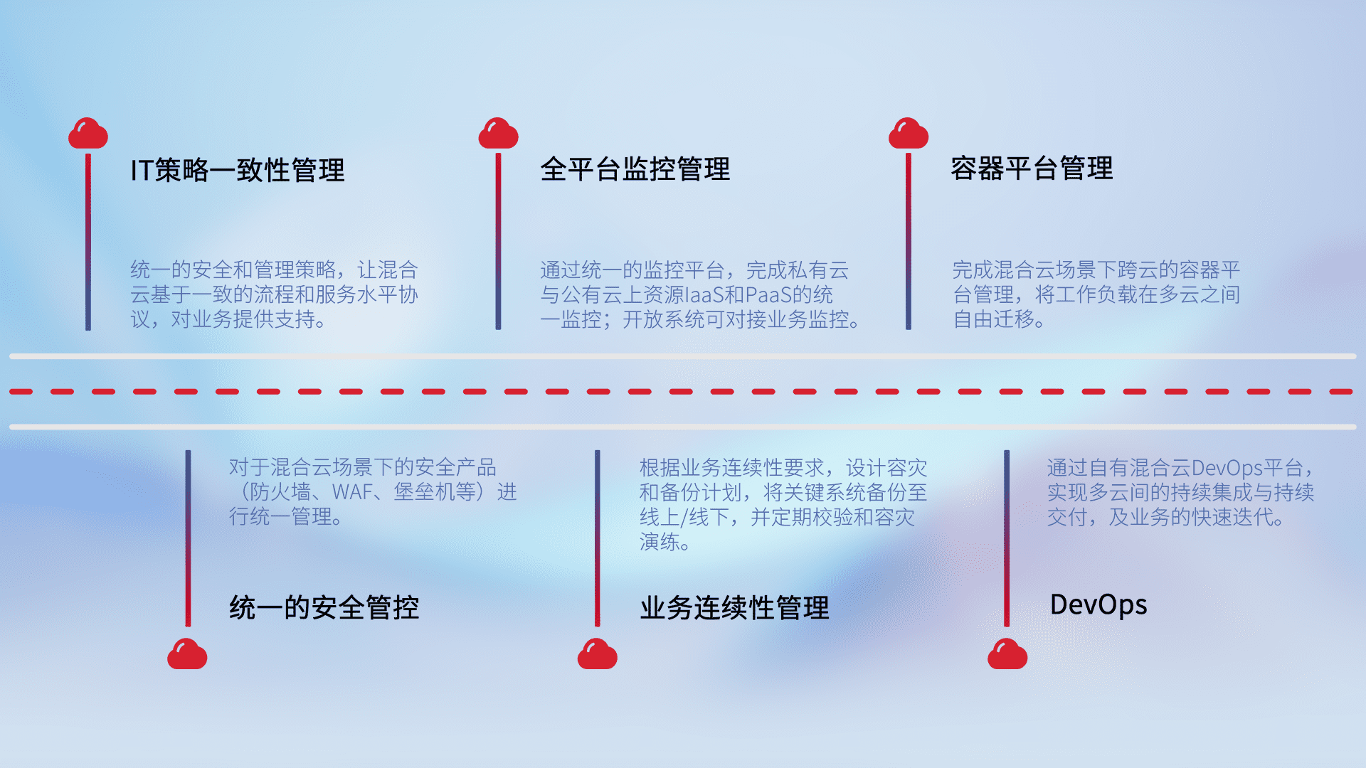 通过多云纳管,,,,以统一的资源数据模型把客户的云资源进行抽象和封装,,,进而实现对多云资源的统一操作,,,保障云资源管理的可靠性、、、、稳定性与可用性。。量身定制化运维内容,,,配置、、、开发运维、、、补丁管理、、备份、、、监控、、、认证和访问管理、、审计和日常巡检等,,,,保障在用云过程中的可靠度,,,稳定度以及高可用率。。。