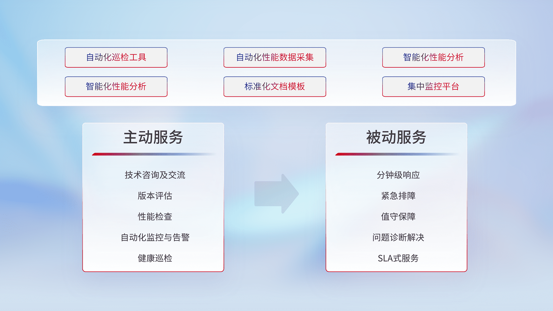智能化工具和标准化文档,,,保障服务质量,,,,提供主动服务(包含技术咨询、、版本评估、、性能检查、、自动化监控与告警、、、、健康巡检)和被动服务包含(分钟级响应、、、、紧急排障、、值守保障、、问题诊断解决、、、、SLA服务)。。